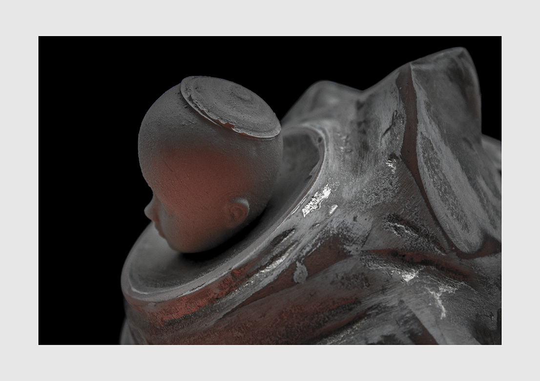 “We've got piles of broken terracotta flower pots in the garden, and I got this feeling I could create some kind of robes-based body-shape from the various fragments. With the aid of some strong contact adhesive I sat down one night and just assembled something that approximated some kind of ceremonial garment with big collars and the semblance of wide sleeves. I had a few references in mind: kimonos, Chinese opera, monastic robes, the Skeksis from The Dark Crystal, the character designs from The Secret Of Kells, Moebius's designs for the spacesuits from Alien, the tailors from Street of Crocodiles... Once I'd 'Frankenstein-ed' the body together, I used filler to mortar the whole lump together, before sanding it all back to arrive at the final form. Some white spray paint and a vinyl doll's head-on-a-lolly-stick later... and I ended up with these rather contemplative characters: part-monk, part-Pope, part-angel, part-cruet..." July 2023
